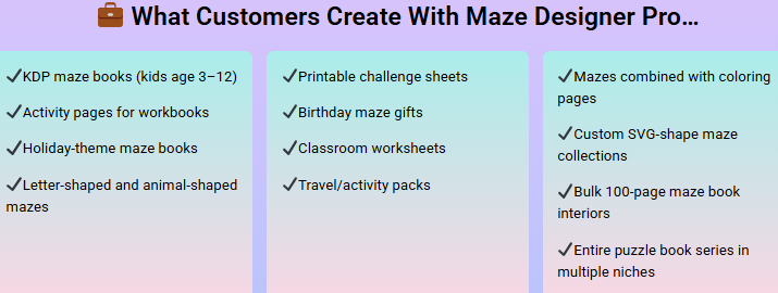 - Quantified Value: Freelancers charge a minimum of $3 to $10 per maze. A simple 100-page book would cost you between $300 and $1,000 to outsource. Your one-time investment in MazemindKDP saves you the cost of just 5-9 outsourced mazes. Everything after that is pure profit.